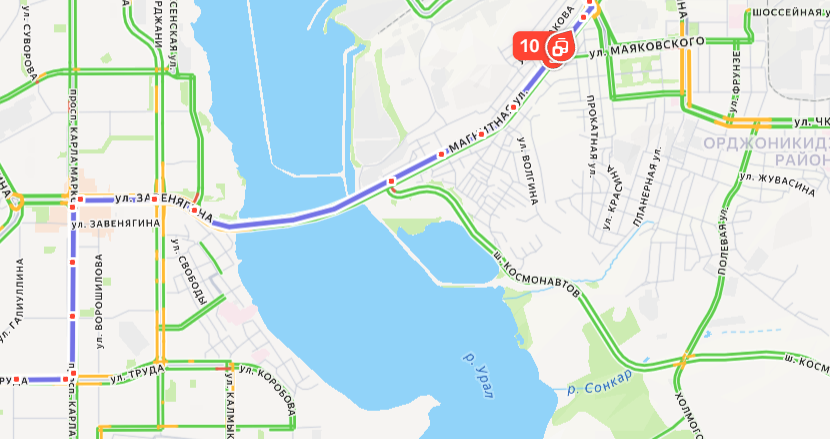 Вид участка дороги с отображением пробок на онлайн-карте.